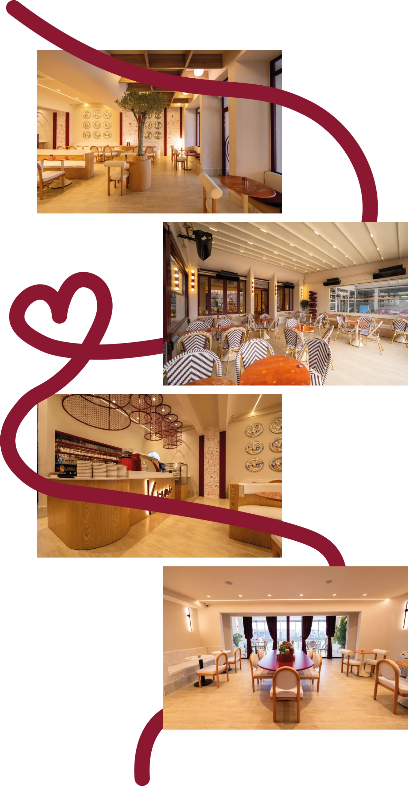 Krem ve açık vişne çürüğü rengindeki tonlar, mekanın şıklığını ve modern havasını vurgular.